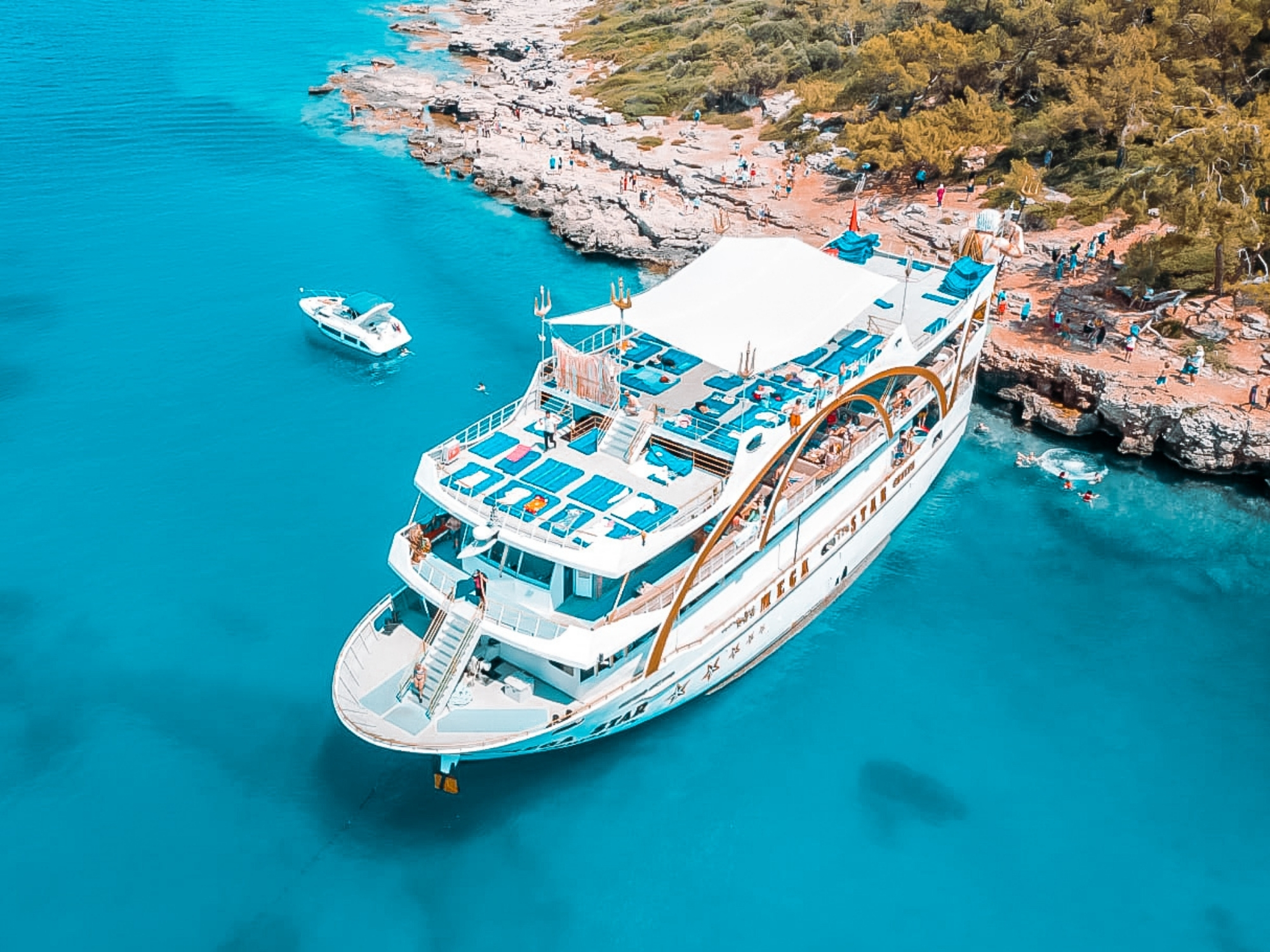 600 kişilik kapasiteli, büyük bir tekne ile Akdeniz’in eşsiz ve güzel koylarına doğru yola çıkacaksınız.